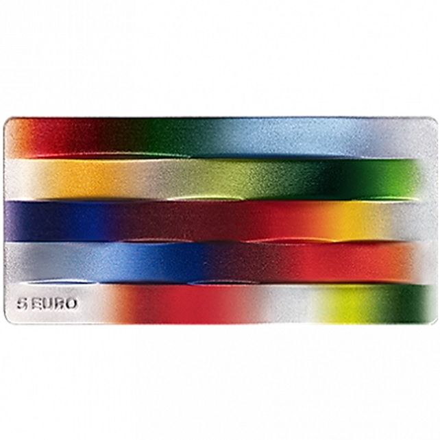 Опис: Монета має горизонтальну прямокутну форму, що відображає горизонтальність, характерну для хору на відкритій сцені. Форма монети є контрпресованою, що створює скульптурний і єдиний хвилеподібний рух, ритм. На аверсі монети зображено п'ять різнокольорових смуг, що символізують ряди хористів, безліч голосів і поліфонію, характерну для хорової музики. Вибрані кольори відповідають відтінкам латвійських національних костюмів. У нижньому лівому куті розміщено напис «5 EURO».