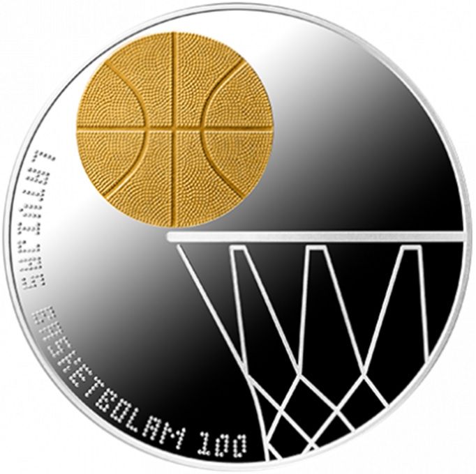 Опис: Баскетбольне кільце з позолоченим м'ячем на обідку. У нижньому лівому куті – напівкруглий напис «LATVIJAS BASKETBOLAM 100» («100 РОКІВ БАСКЕТБОЛУ В ЛАТВІЇ»).