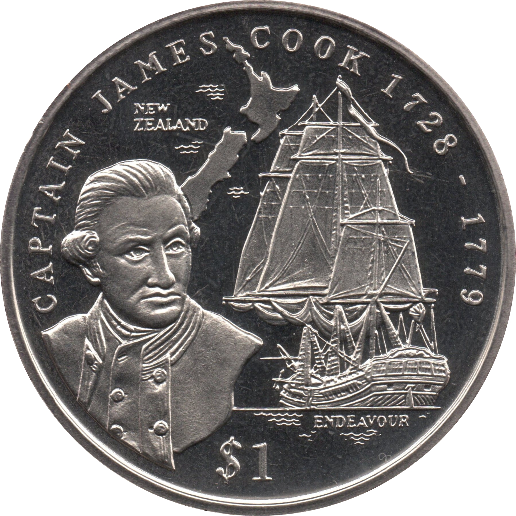 Опис: Бюст капітана Джеймса Кука, корабель «Ендевор» і карта Нової Зеландії.