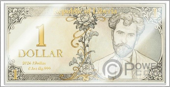 Опис: Прямокутна монета з малюнком, схожим на малюнок банкноти, із кольоровим портретом Альфонса Мухи, зверненим праворуч, та квітковими візерунками навколо нього.
