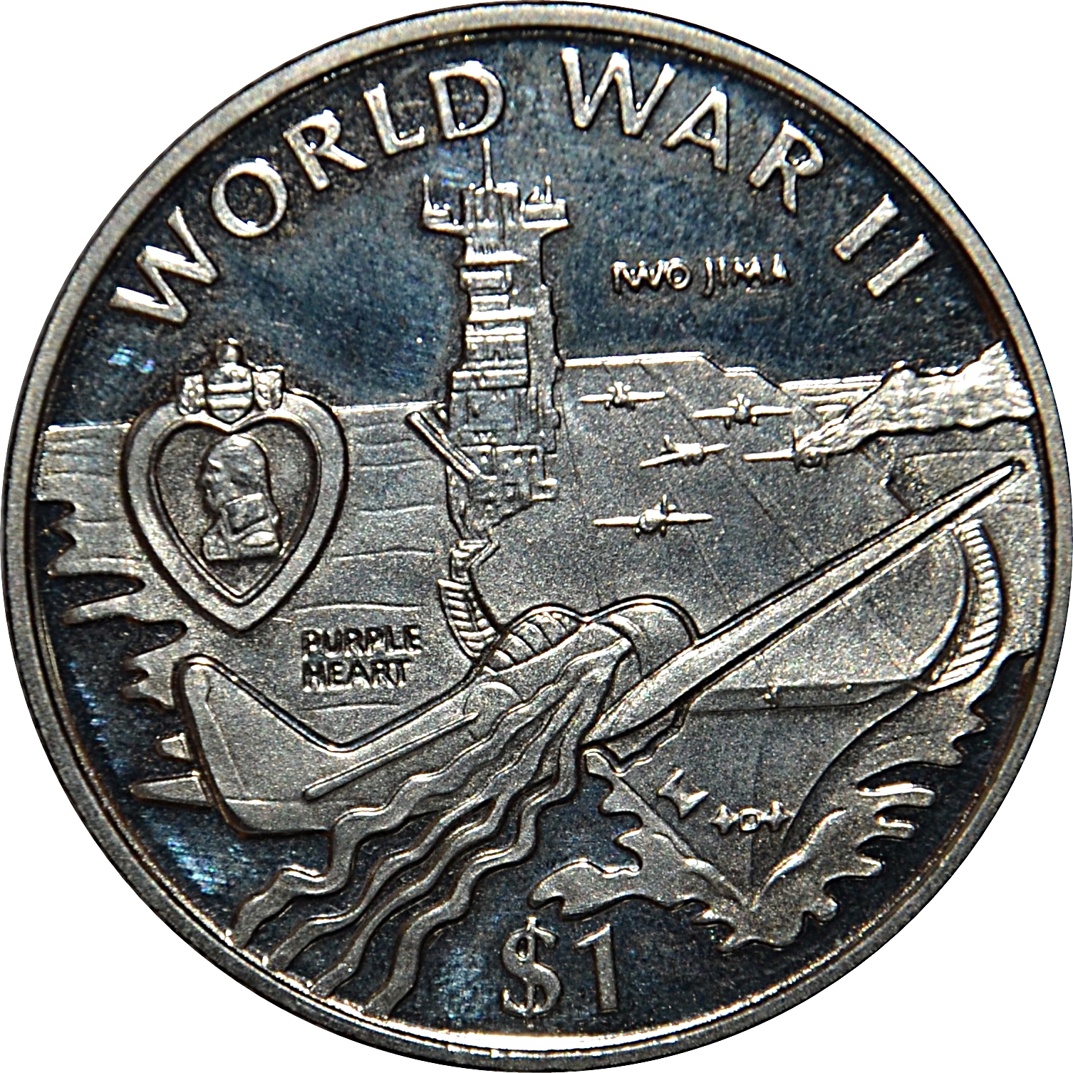 Опис: Медаль «Пурпурне серце» у верхньому лівому куті пошкодженого літака, що приземляється на авіаносець.