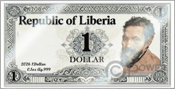 Опис: Прямокутна монета з малюнком, схожим на малюнок банкноти, із кольоровим портретом Мікеланджело, зверненим праворуч, та геометричними візерунками навколо нього.