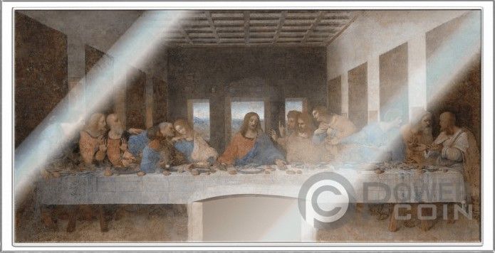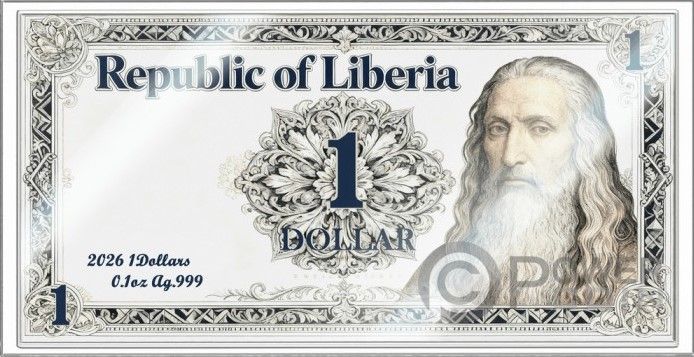 Опис: Прямокутна монета з дизайном, схожим на дизайн банкноти, із кольоровим портретом Леонардо да Вінчі, зверненим вправо, та геометричними візерунками навколо нього.