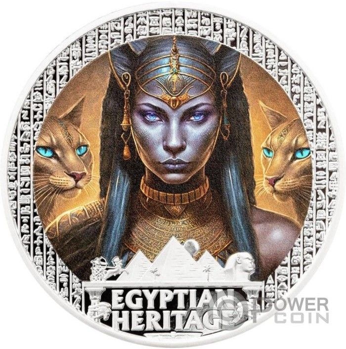 Опис: Кольорове, створене на комп’ютері зображення Бастет, оточеної котами в центрі, комплексу пірамід Гізи внизу та ієрогліфів на обідку.