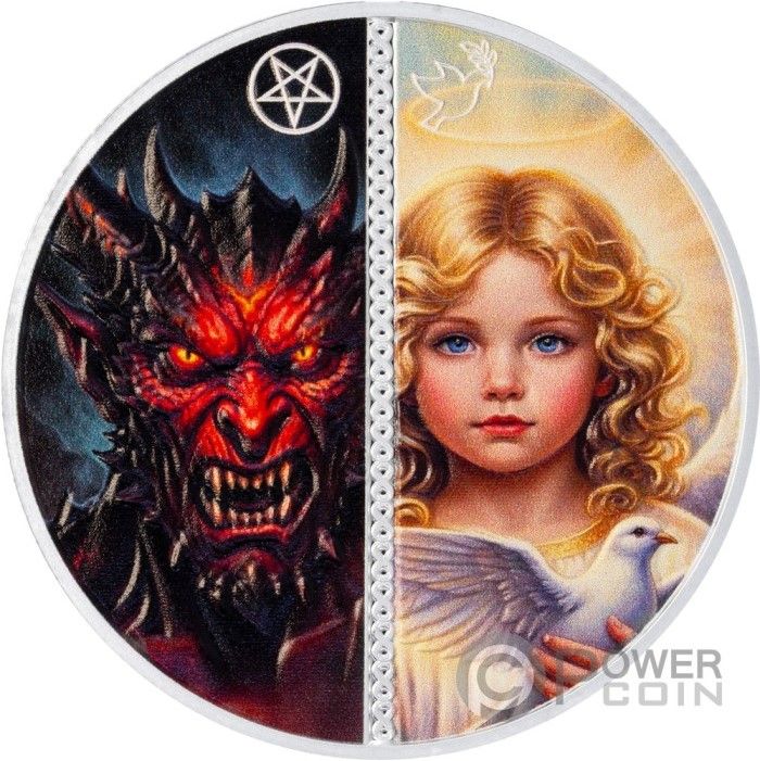 Опис: Зліва — кольорове зображення Диявола та зірки Диявола над ним, а праворуч — кольорове зображення ангельської дівчини з голубом миру в руці та стилізованим голубом з оливковою гілкою над нею.