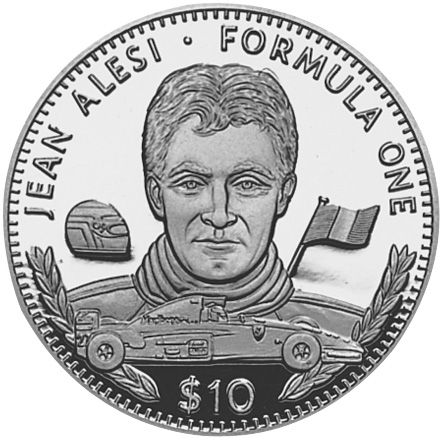 Опис: Бюст Жана Алезі, шолом пілота, гоночний автомобіль і прапор з вінком.