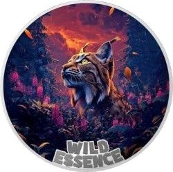 Опис: Сидяча кольорова рись, оточена рослинністю.