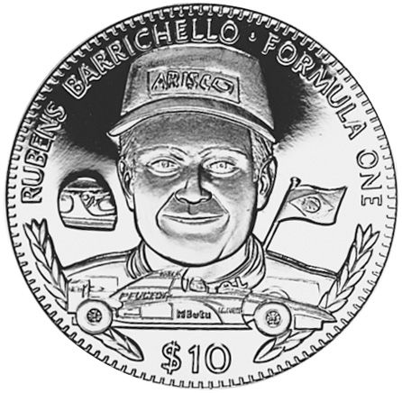 Опис: Бюст Рубенса Баррікелло, шолом пілота, гоночний автомобіль і прапор з вінком.