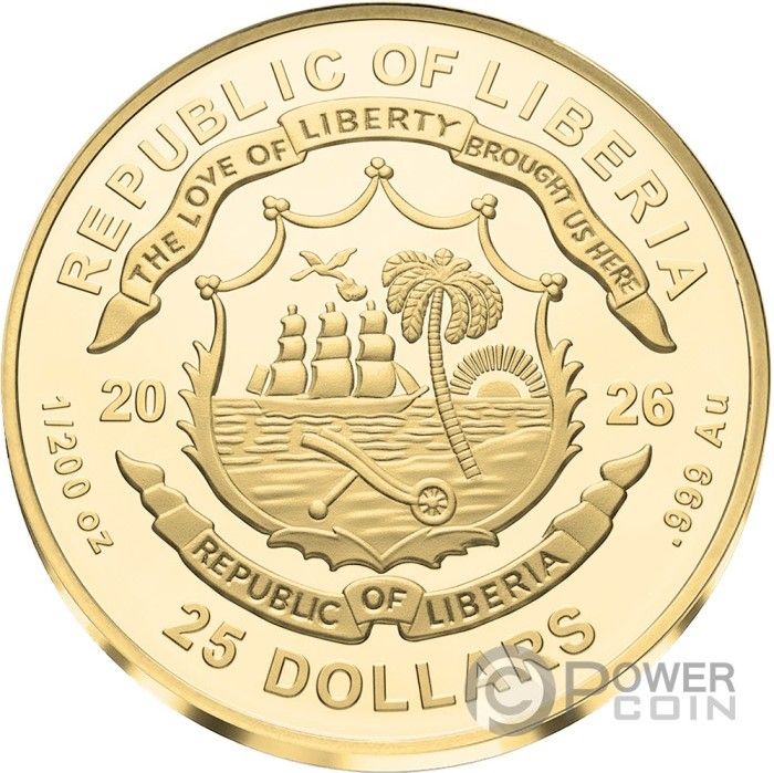 Опис: Герб Ліберії, що розділяє дату в центрі, з назвою країни зверху та вагою, номіналом і пробою знизу.