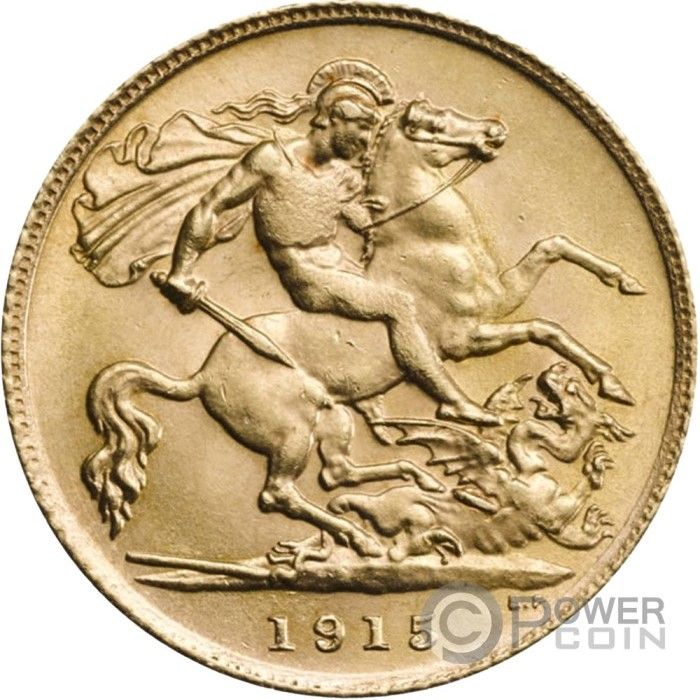 Опис: Реверс британського суверена 1915 року (Святий Георгій верхи на коні, обернений праворуч, у шоломі та плащі, тримає меч у правій руці, під ним — вбитий дракон).