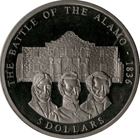 Опис: На монеті зображені бюсти Джима Боуї, Вільяма Баррета Тревіса та Девіда Крокетта, а за ними — церква Аламо.