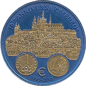 Опис: Градчани, Замковий район Праги, монета номіналом 1 чеська крона (KM# 7) та зворотний бік монети номіналом 1 євро.