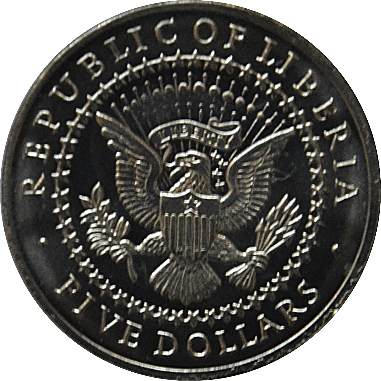 Опис: Модифікована печатка президента Сполучених Штатів (E PLURIBUS UNUM замінено на LIBERTY, у верхній частині щита додано контур однієї зірки), оточена написом REPUBLIC OF LIBERIA зверху та номіналом знизу.