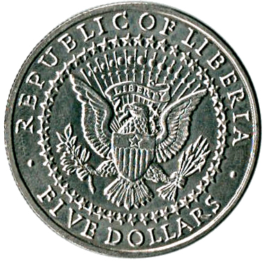 Опис: Модифікована печатка президента Сполучених Штатів (E PLURIBUS UNUM замінено на LIBERTY, у верхній частині щита додано контур однієї зірки), оточена написом REPUBLIC OF LIBERIA зверху та номіналом знизу.