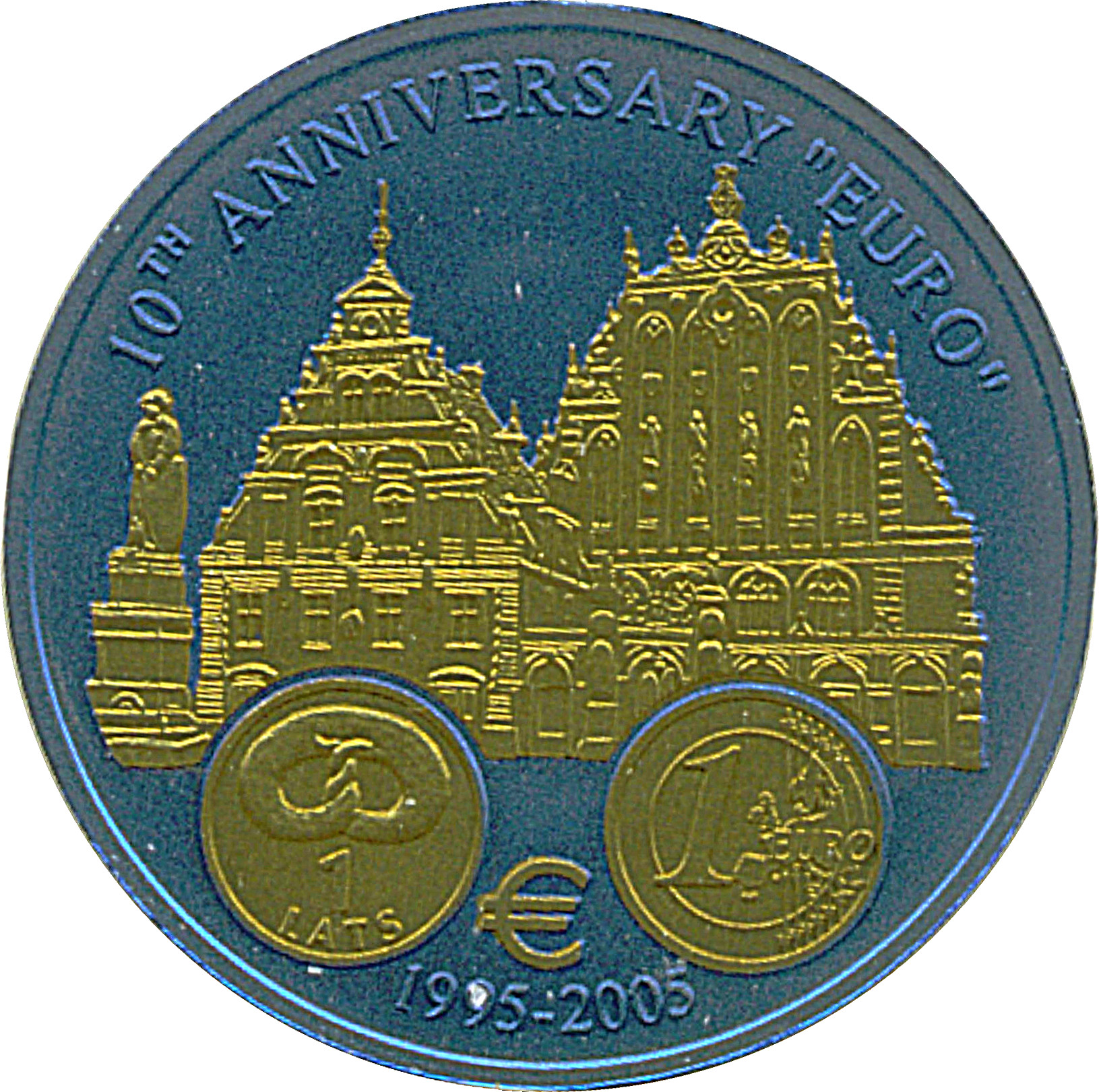 Опис: Будинок Чорноголових у Ризі, монета номіналом 1 лат (KM# 66) та зворотний бік монети номіналом 1 євро.