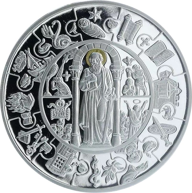 Опис: Повна фігура апостола Павла, чотири релігійні зображення навколо нього, а по зовнішньому периметру у вигляді взаємопов'язаних частин пазла — репрезентативні фігури апостола Павла.