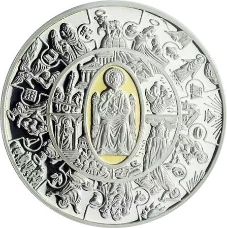 Опис: Повна фігура апостола Петра, що сидить, чотири релігійні зображення навколо нього, а по зовнішньому периметру у вигляді взаємопов'язаних частин пазла — фігури, що символізують апостола Петра.