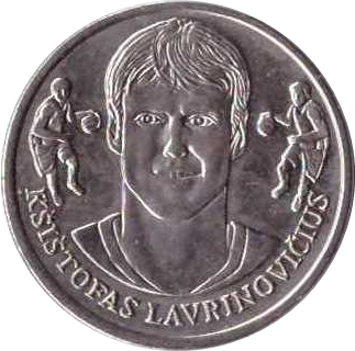 Опис: КШІШТОФАС ЛАВРИНОВІЧЮС (1979). З баскетбольною командою Литви виграв золоту медаль на чемпіонаті Європи 2003 року, срібну медаль 2013 року та бронзову медаль 2007 року.