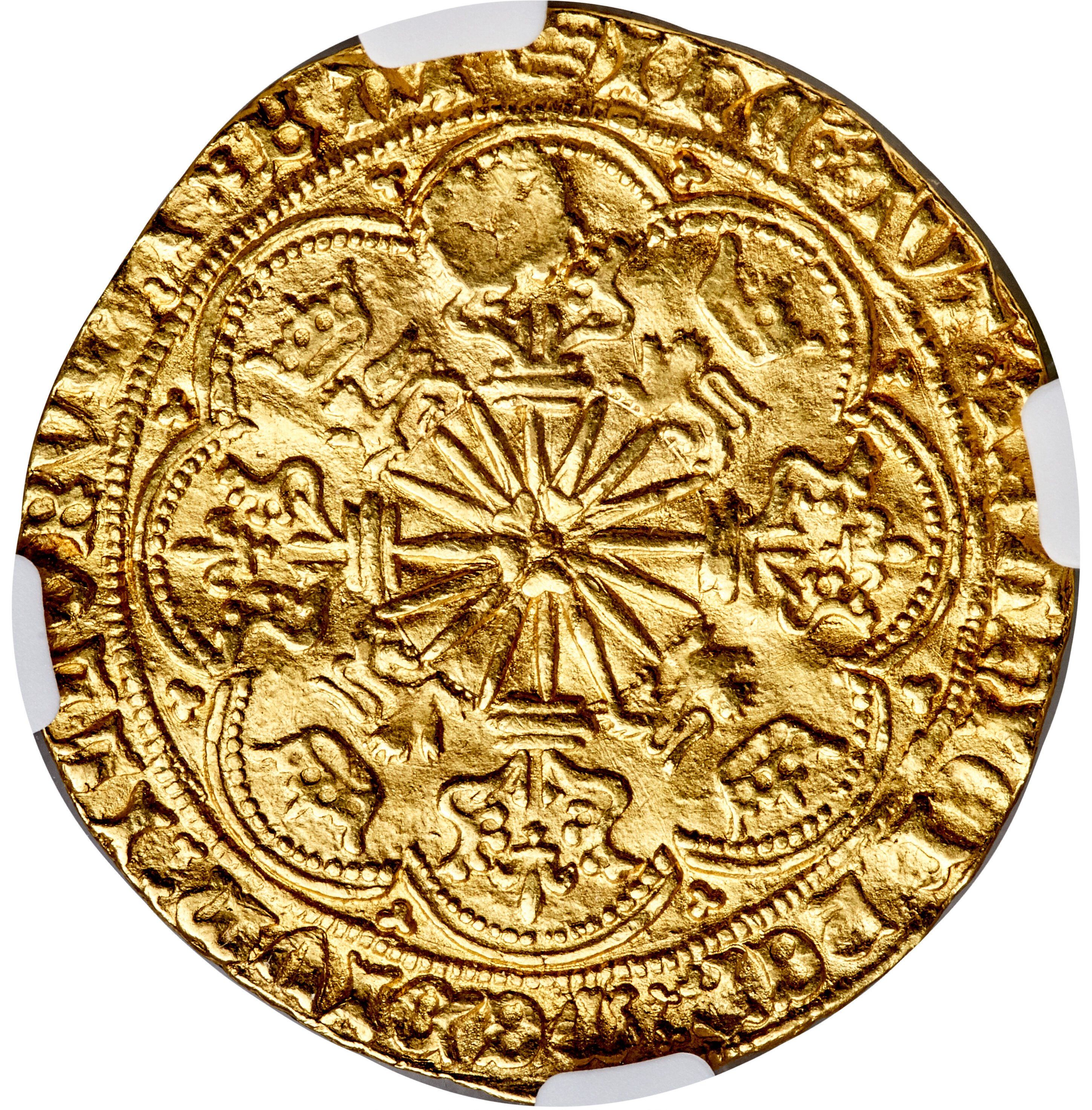 Опис: Король Едуард IV стоїть обличчям до глядача, тримаючи меч і щит, на кораблі з бушпритом, Є на прапорі на кормі, троянда на корпусі, хрест над перехрещеними ключами, контрштамп.