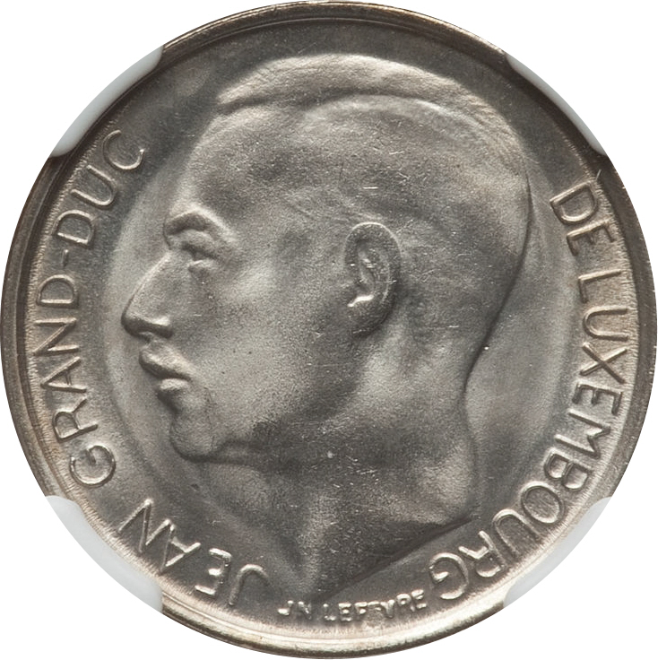 Опис: Портрет ліворуч Жана (1921-), великого герцога Люксембургу з 1964 по 2000 рік, оточений легендою. Підпис J.N. LEFEVRE під вирізом шиї.
