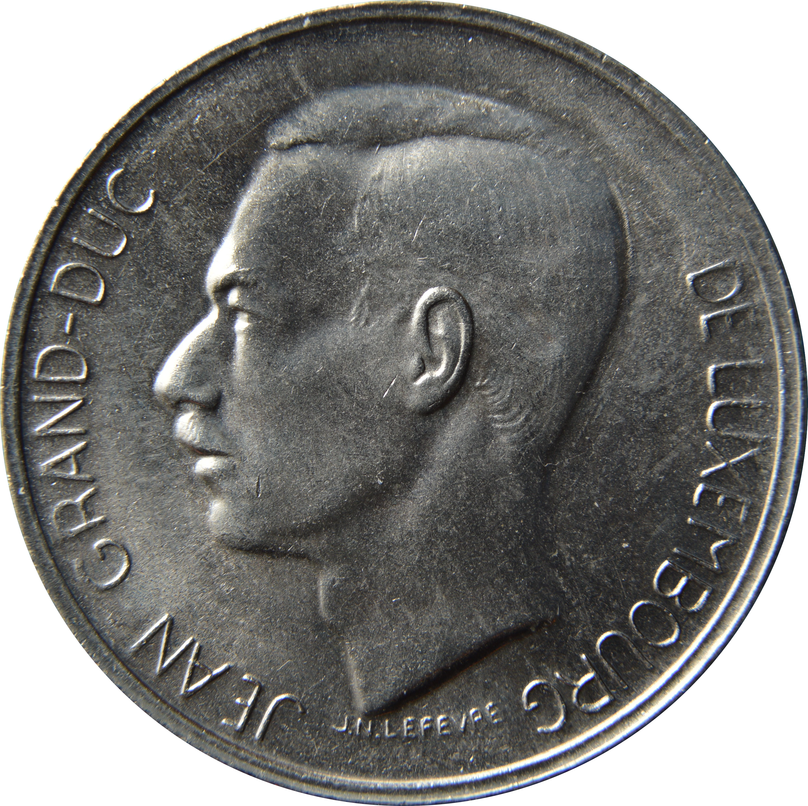 Опис: Портрет Жана (1921-2019), великого герцога Люксембургу з 1964 по 2000 рік, оточений легендою та підписом граверів.
