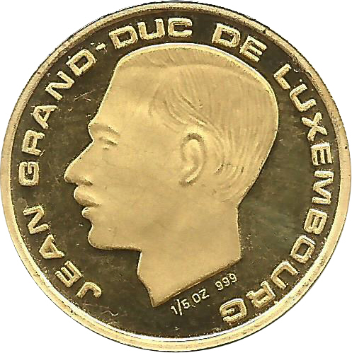 Опис: Портрет ліворуч Жана (1921-), великого герцога Люксембургу з 1964 по 2000 рік, оточений легендою. Під головою титул «1/5 OZ 999».