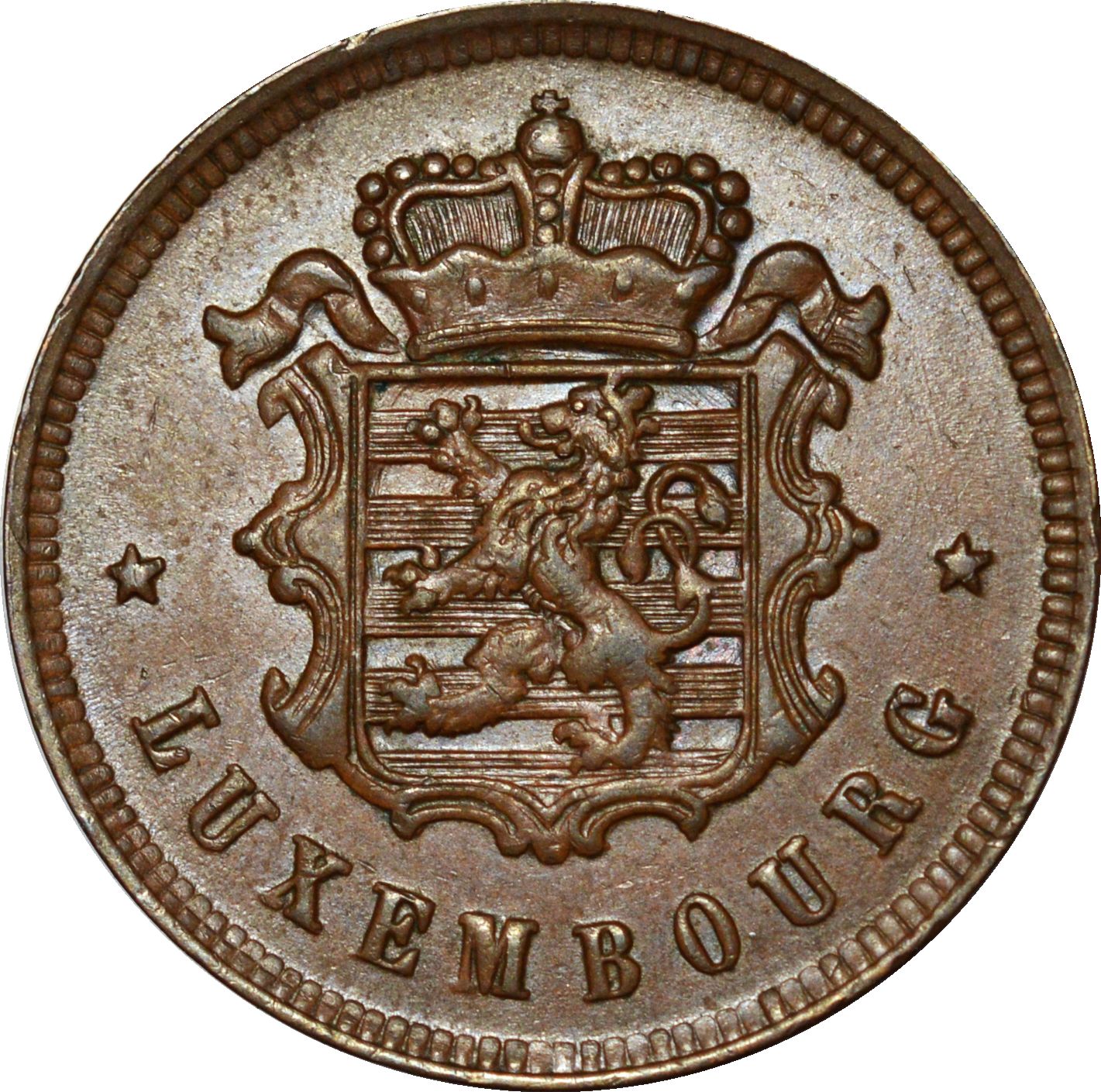 Опис: Коронований і прикрашений щит з люксембурзьким левом з роздвоєним хвостом, що повзе ліворуч, на полі з десяти частин, оточений назвою країни між двома зірками та зовнішнім поясом.