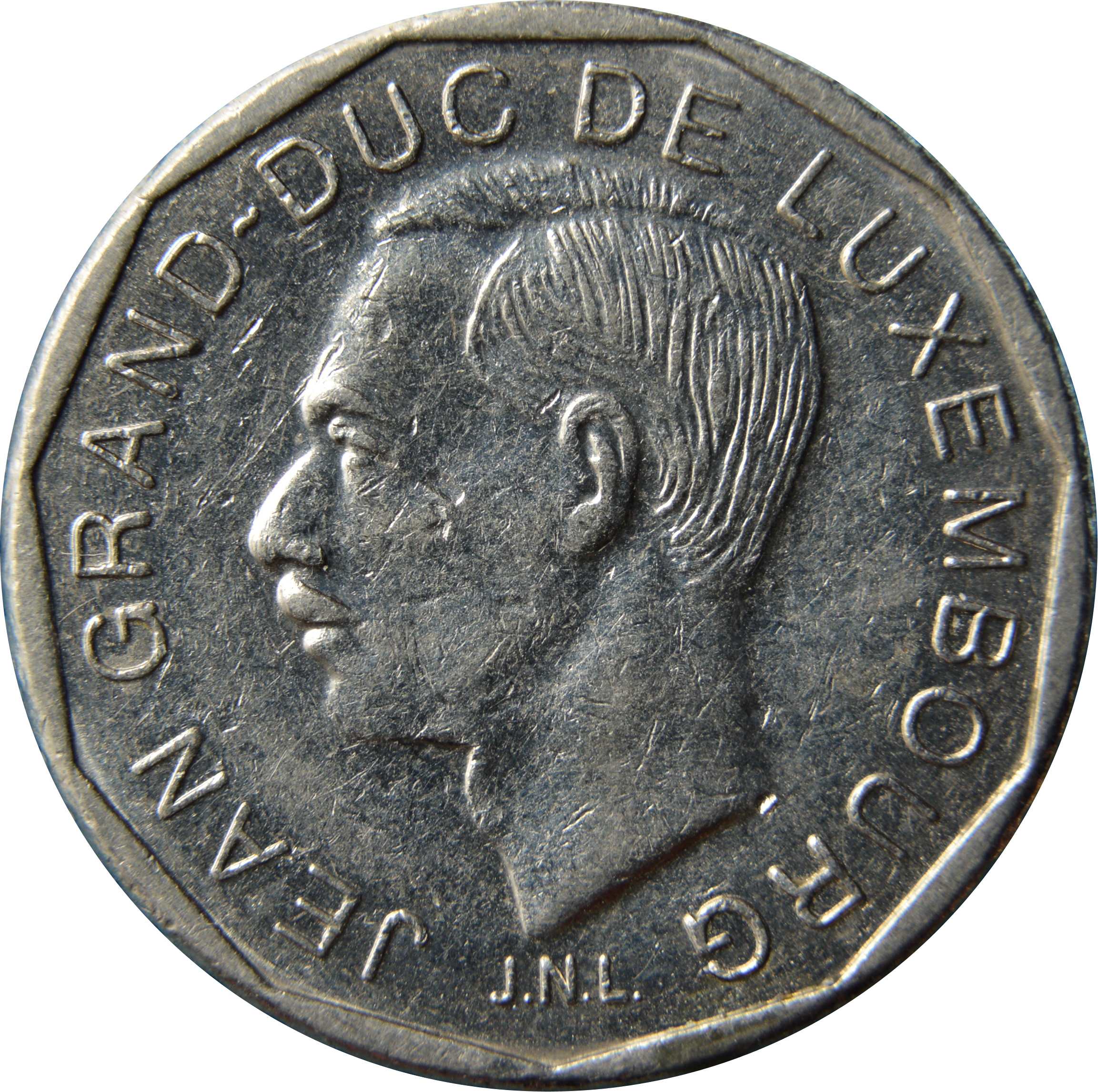 Опис: Портрет ліворуч Жана (1921-), великого герцога Люксембургу з 1964 по 2000 рік, оточений легендою. Підпис J.N.L. під шиєю.