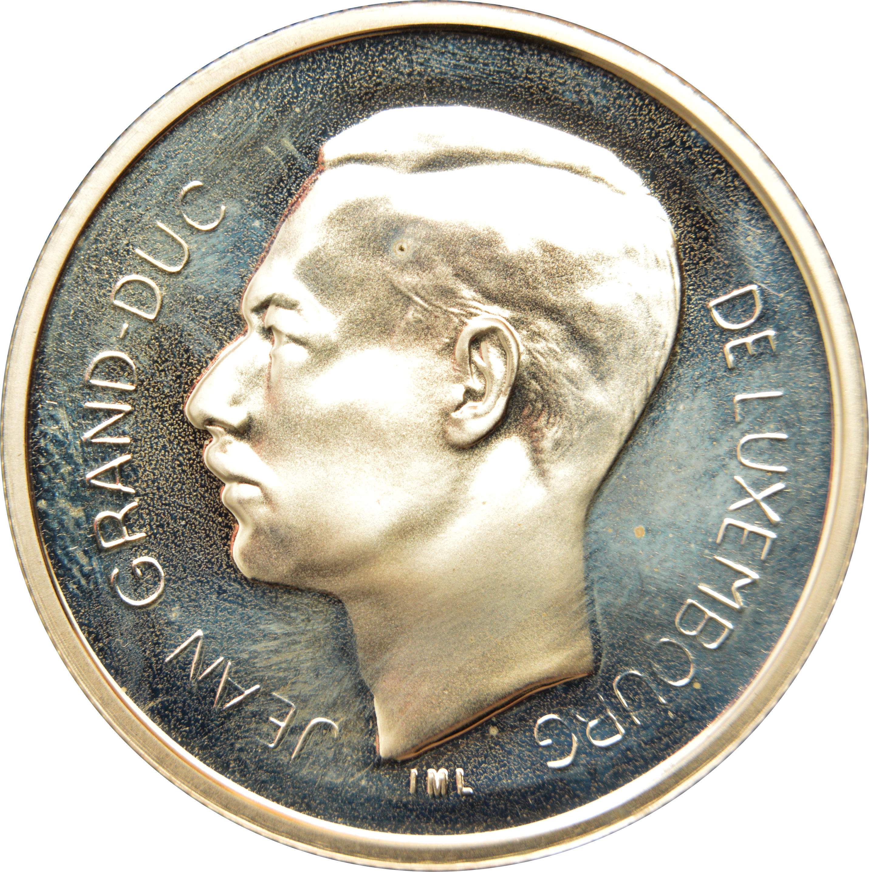 Опис: Портрет ліворуч Жана (1921-), великого герцога Люксембургу з 1964 по 2000 рік, оточений легендою та номіналом. Під головою — ініціали Люксембурзького монетарного інституту (IML).