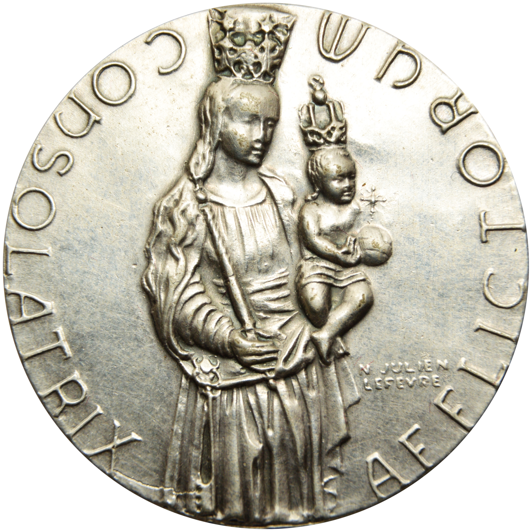 Опис: Богоматір Утішителька та її син, за статуєю, встановленою в соборі міста Люксембург, оточені круговою легендою та іменами граверів.