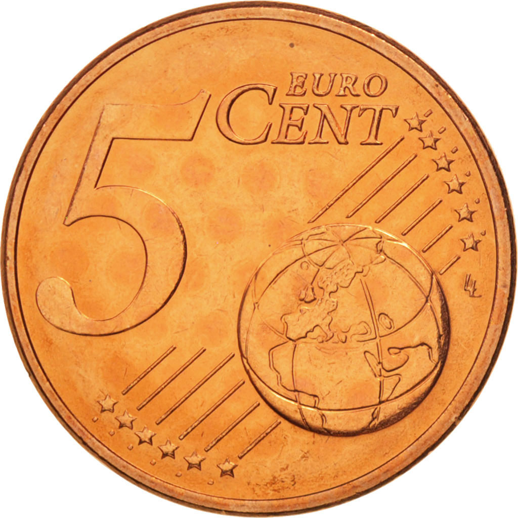 Опис: Ліворуч: цифра 5 та напис EURO CENT. Праворуч: на монеті зображено Європу у відношенні до Африки та Азії на глобусі з 6 променистими зірками з кожного боку.