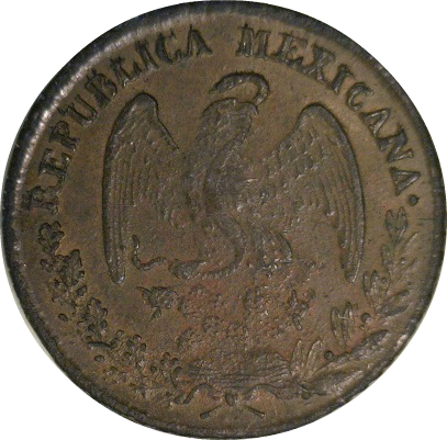 Опис: Орел з розпростертими крилами, що стоїть на кактусі нопал (опунція), обернений праворуч, з змією в дзьобі, оточений напіввінком з дуба та лавра знизу і написом REPUBLICA MEXICANA зверху.