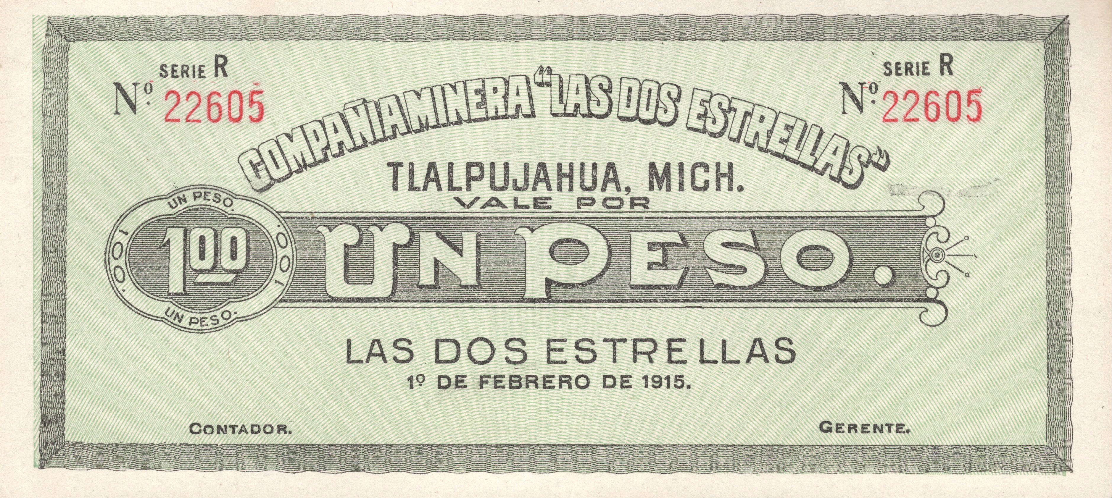 1 песо (Compañía Minera «Las Dos Estrellas») 1915 – 1915 Мічоакан, штат