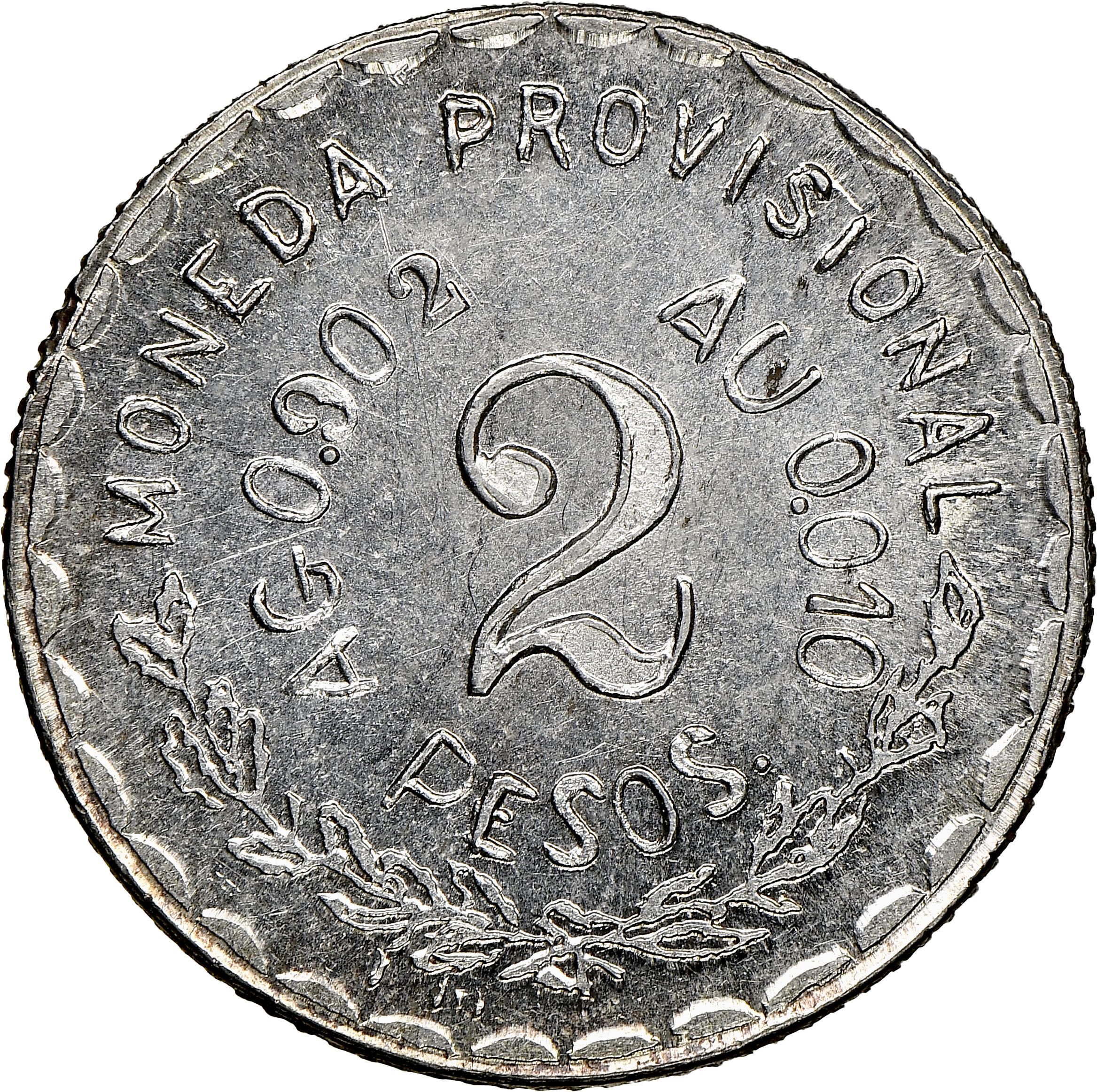 Назва: 2 песо (Тимчасовий уряд; незавершені лацкани)