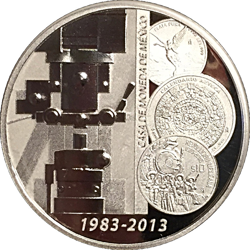 Опис: Головний фасад мексиканського монетного двору в Сан-Луїс-Потосі, увінчаний логотипом 30-річчя та трьома монетами.