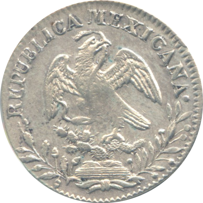 Опис: Державний герб (Республіка). Орел, спрямований праворуч, з змією в дзьобі, стоїть на кактусі, що росте з каменю посеред озера. З лавровим і дубовим вінком внизу та написом зверху.
