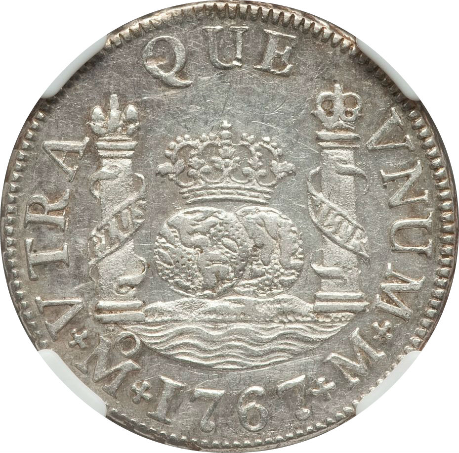 Опис: Короновані глобуси, оточені коронованими стовпами з прапором. Навколо — легенда, ініціали монетного двору та пробірника, а внизу — дата.