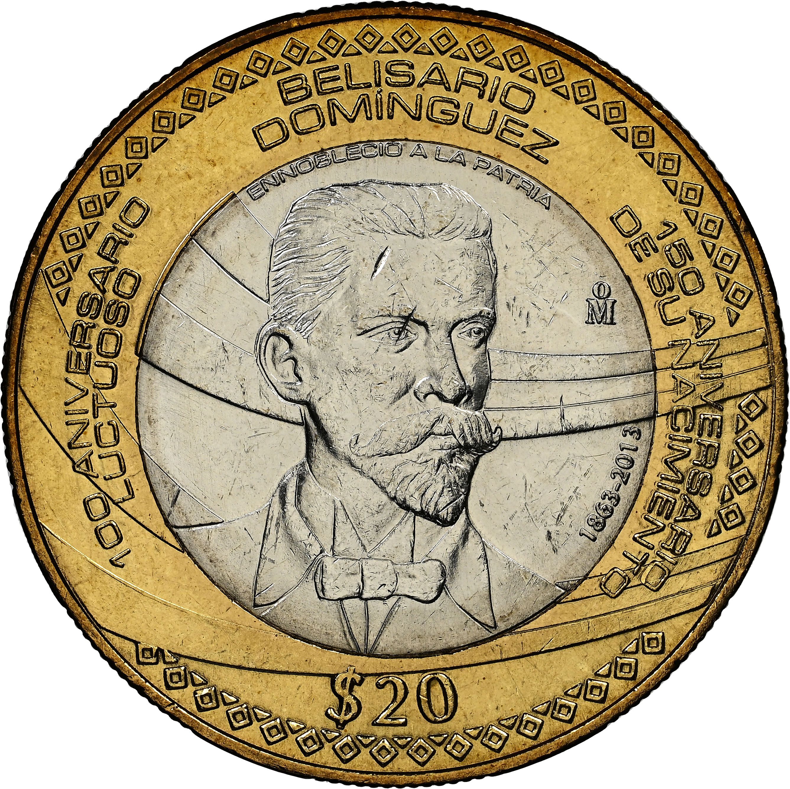 Опис: У внутрішній частині монети зображено бюст Белісаріо, оточений написами «Enriqueció a la Patria» над головою та «1863-2013» під знаком монетного двору Мексики (M°) у правій частині. У верхньому полі зовнішнього кільця розміщено напис «Belisario Domínguez». З лівого боку монети розміщено напис «100 Aniversario Luctuoso», а з правого — «150 Aniversario de su Nacimiento». У нижньому полі або ексергу вказано номінал — 20 песо. Зовнішнє кільце монети прикрашено чотирикутними та трикутними фризами.