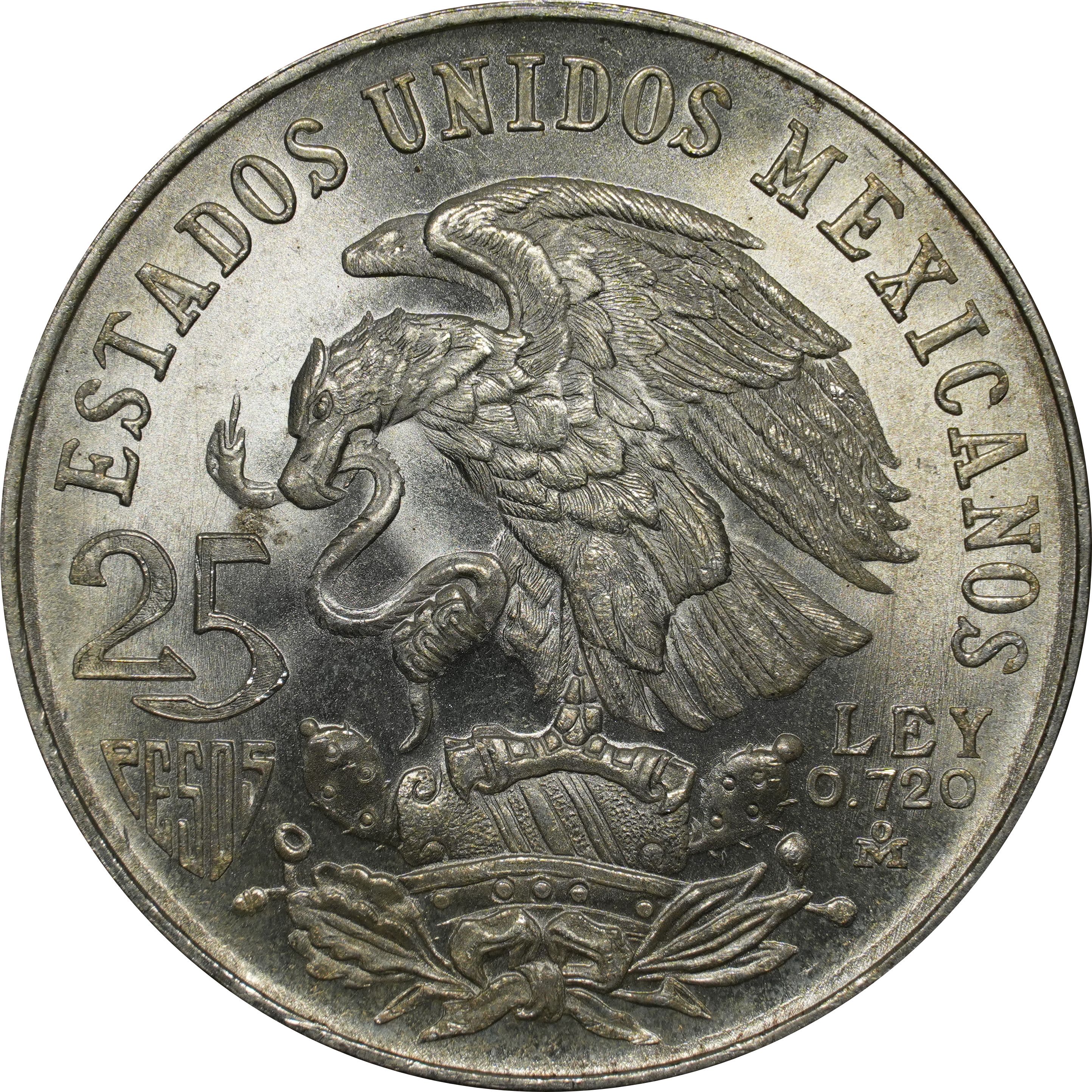 Опис: Герб Мексики (орел, звернений вліво, з написом у верхній частині), з номіналом ліворуч і пробою срібла та знаком монетного двору праворуч.