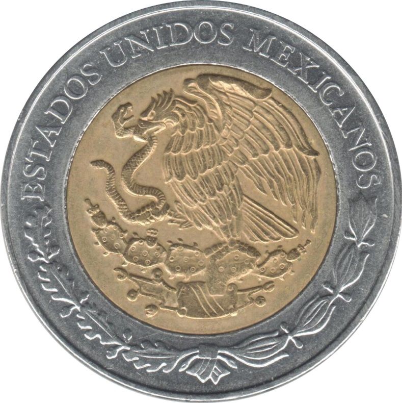 Опис: У центрі — національний герб (мексиканський золотий орел, що сидить на колючому кактусі і пожирає змію) у скульптурному рельєфі.