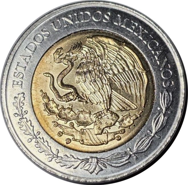 Опис: Національний герб Мексики, на якому зображено мексиканського золотого орла, що сидить на кактусі опунції та пожирає змію, над піввіночком з дуба та лавра, а нижче — напис «ESTADOS UNIDOS MEXICANOS», що утворює верхнє півколо.