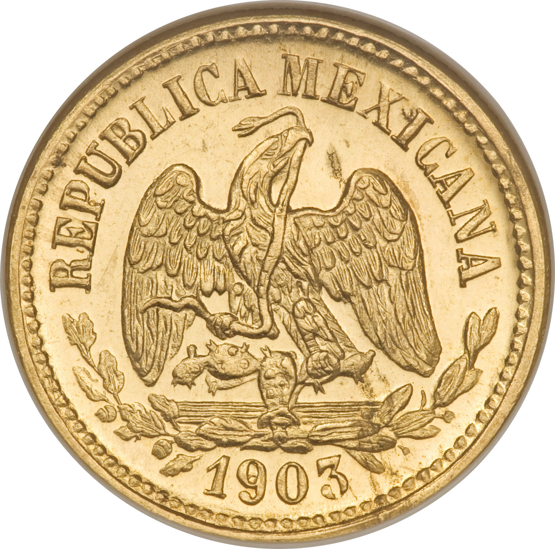 Опис: Державний герб: орел із змією в дзьобі, що стоїть на кактусі посеред озера. З написом у верхній частині та дубовим і лавровим вінком у нижній частині. З датою під ним.