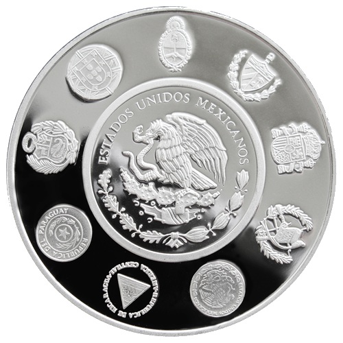 Опис: Герб Мексики, оточений гербами Аргентини, Куби, Іспанії, Гватемали, Мексики, Нікарагуа, Парагваю, Перу та Португалії.
