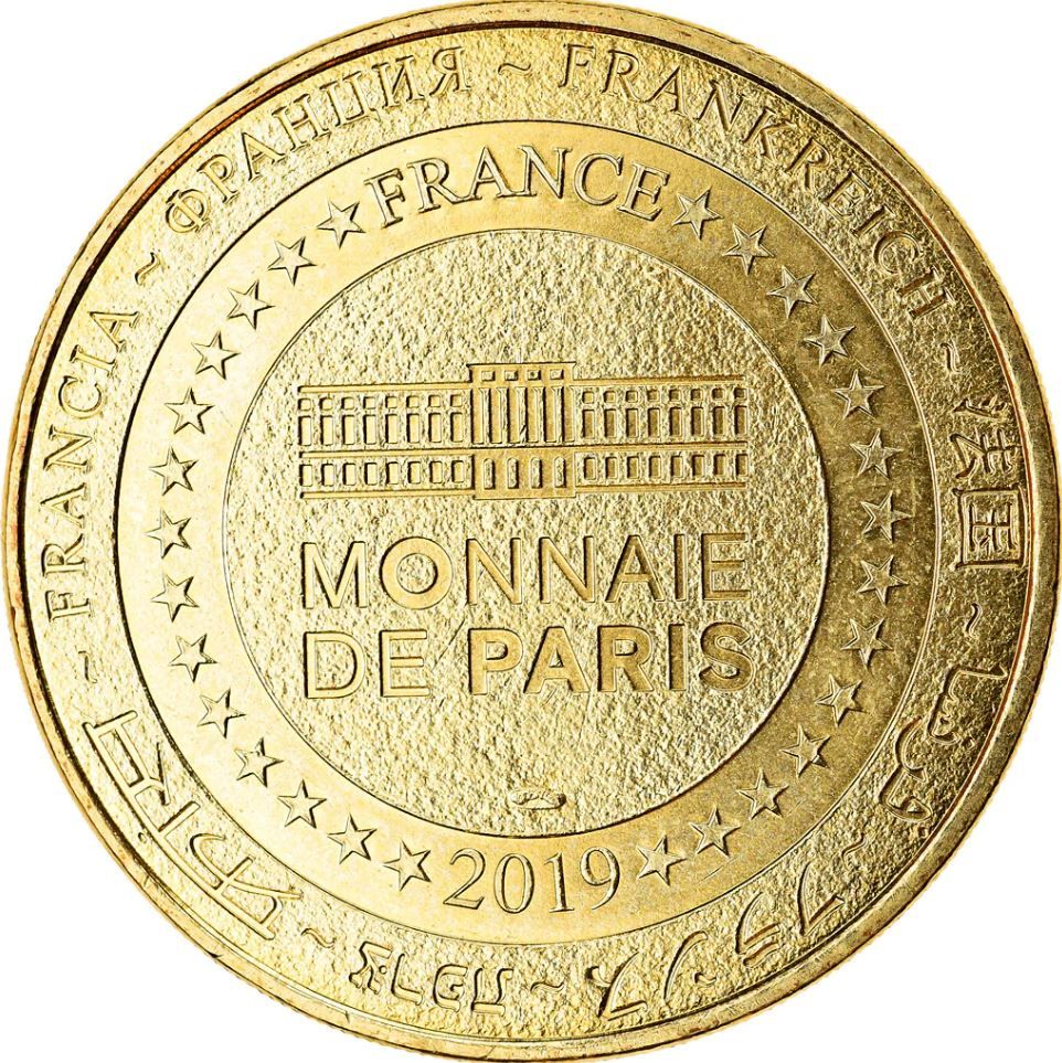 Опис: На периферії слово «Франція» написано вісьмома мовами. Франція на 12-й годині, 2019 рік на 6-й годині, все пов'язане 14 зірками праворуч і ліворуч. У центрі — будівля Монетного двору Парижа.