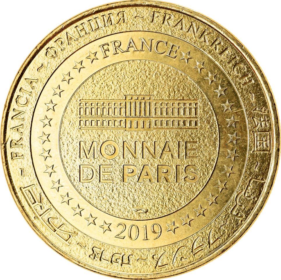 Опис: На периферії слово «Франція» написано вісьмома мовами. Франція на 12-й годині, 2019 рік на 6-й годині, все пов'язане 14 зірками праворуч і ліворуч. У центрі — будівля Моне де Парі.