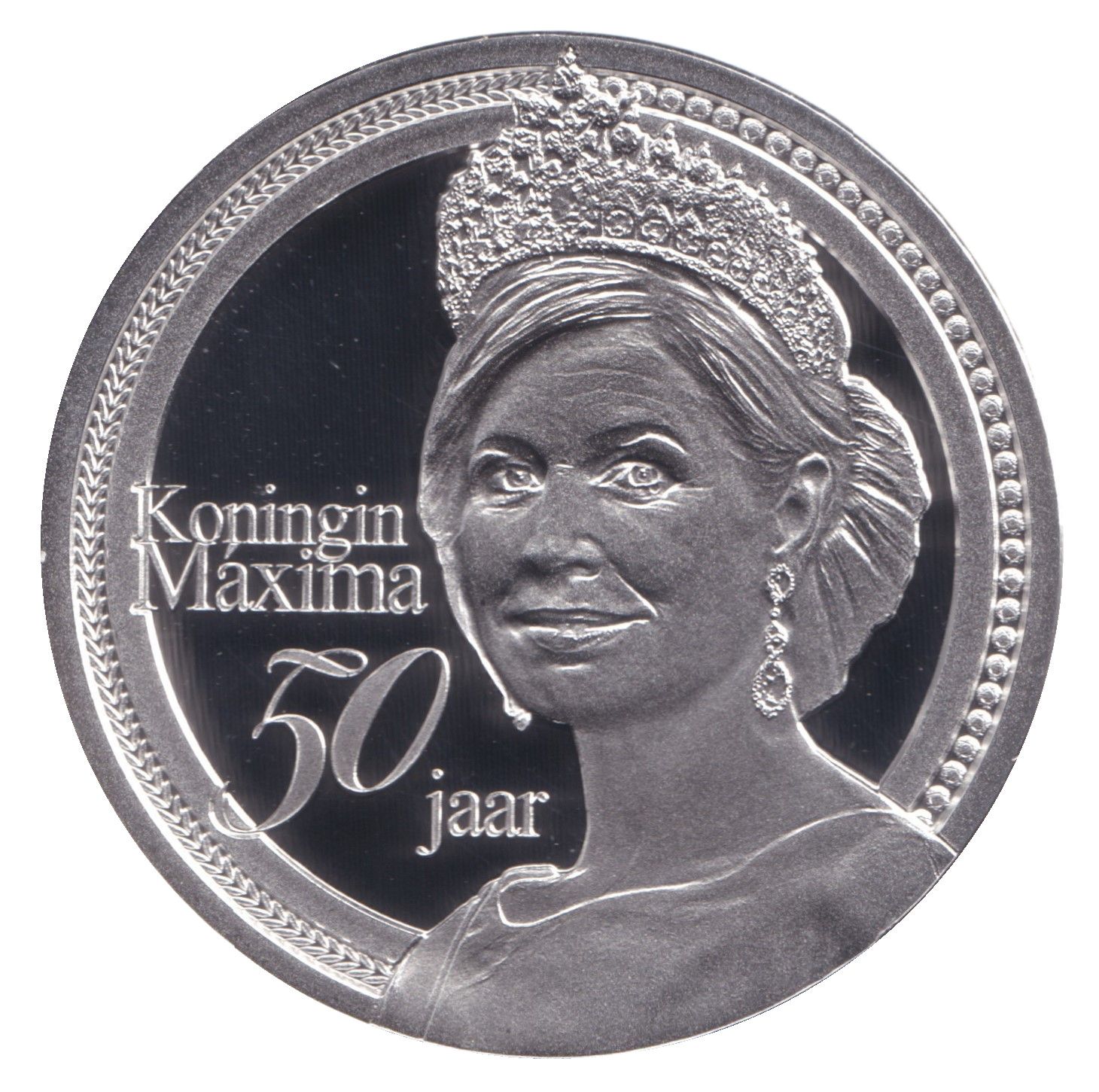 Опис: Портрет королеви Максими. Зліва ви бачите лавровий вінок, символ святкування, що відповідає урочистій нагоді. Крім того, праворуч зображено ряд діамантів, що підкреслює стійкість і чистоту.