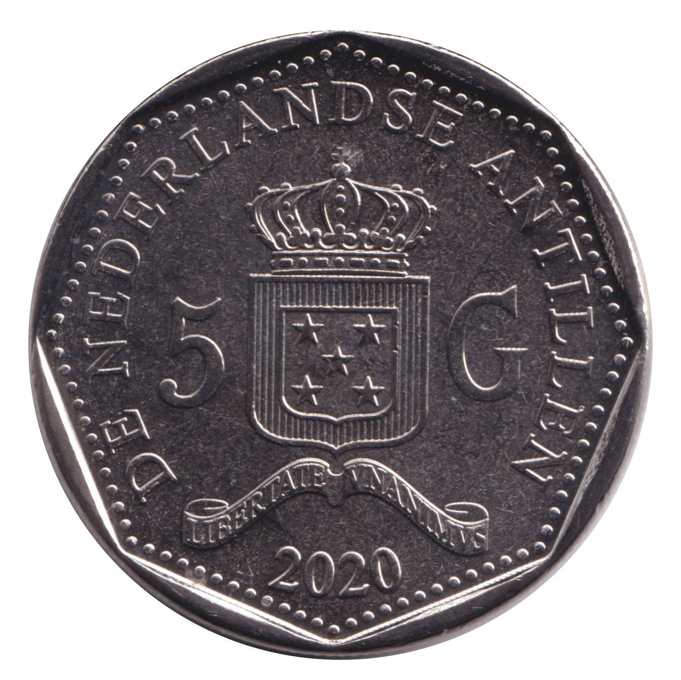 Опис: На зворотному боці монети зображено герб колишньої країни Нідерландські Антильські острови, номінал 5 гульденів та рік випуску 2020.