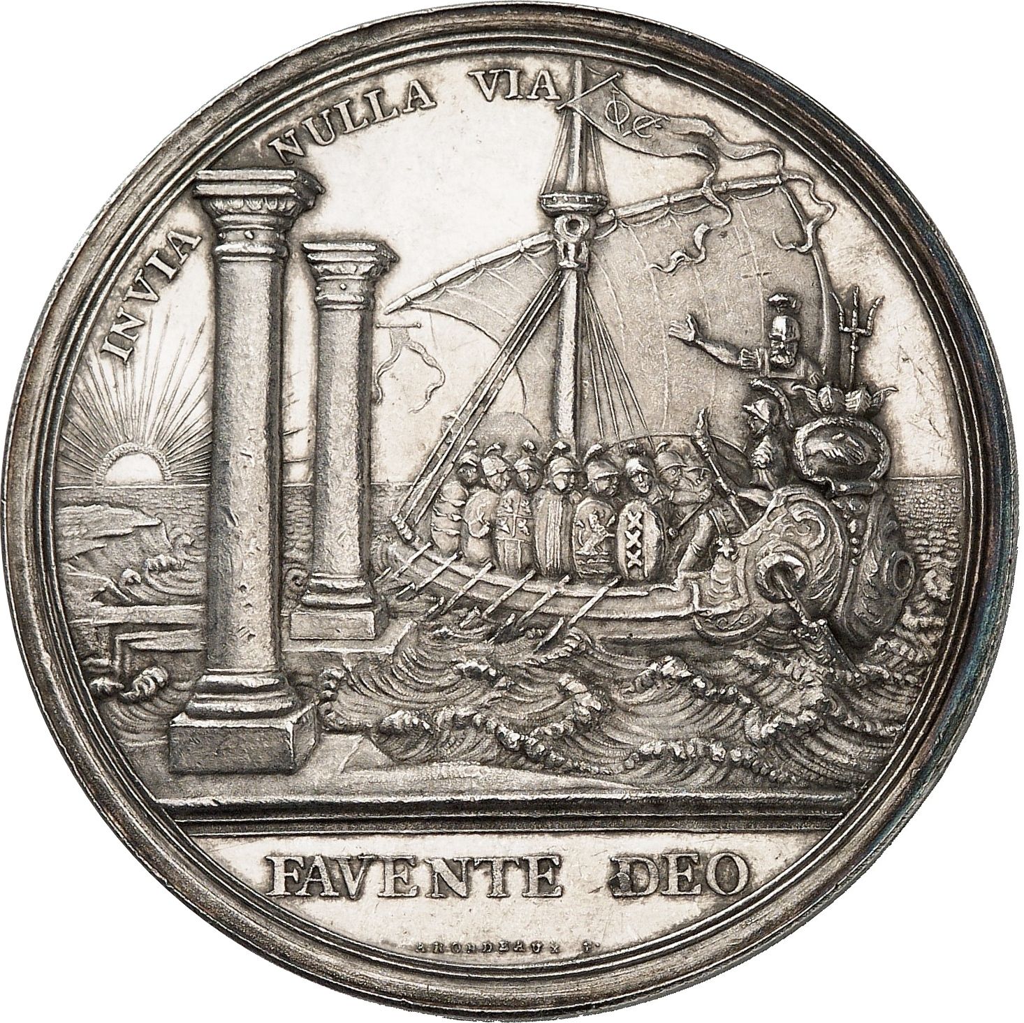 Опис: Корабель Ост-Індської компанії пливе на схід повз Гераклеві стовпи; на кораблі зображені персоніфіковані члени компанії зі своїми гербами, а ліворуч на задньому плані — захід сонця.