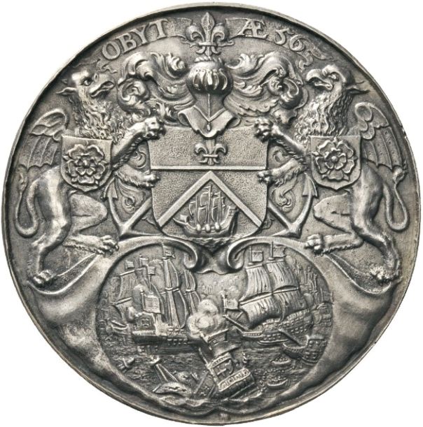 Опис: Погруддя Тромпа з оголеною головою, звернене вперед; на обрізі руки — PVA (лігатура) F; поля згладжені для усунення рослинного орнаменту; все в лавровому вінку.