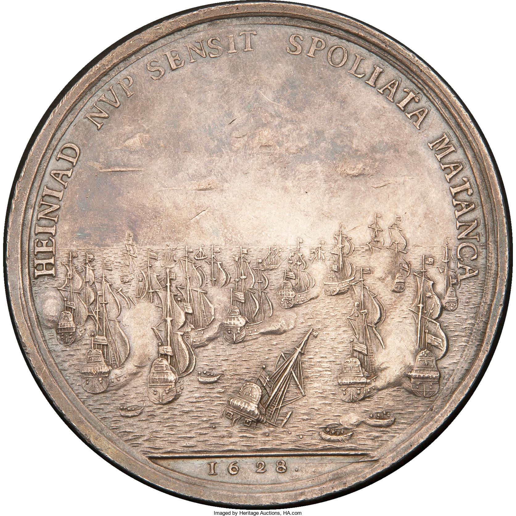 Опис: Захоплення іспанських кораблів, один з яких тоне на передньому плані, дата битви — 1628 рік — у нижній частині монети.